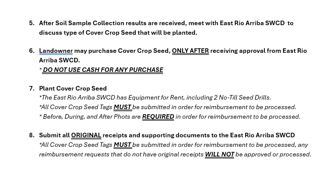 The Cover Crop Program Process is below. For a printable version, please CLICK HERE. Please call 505-753-0477 for any questions